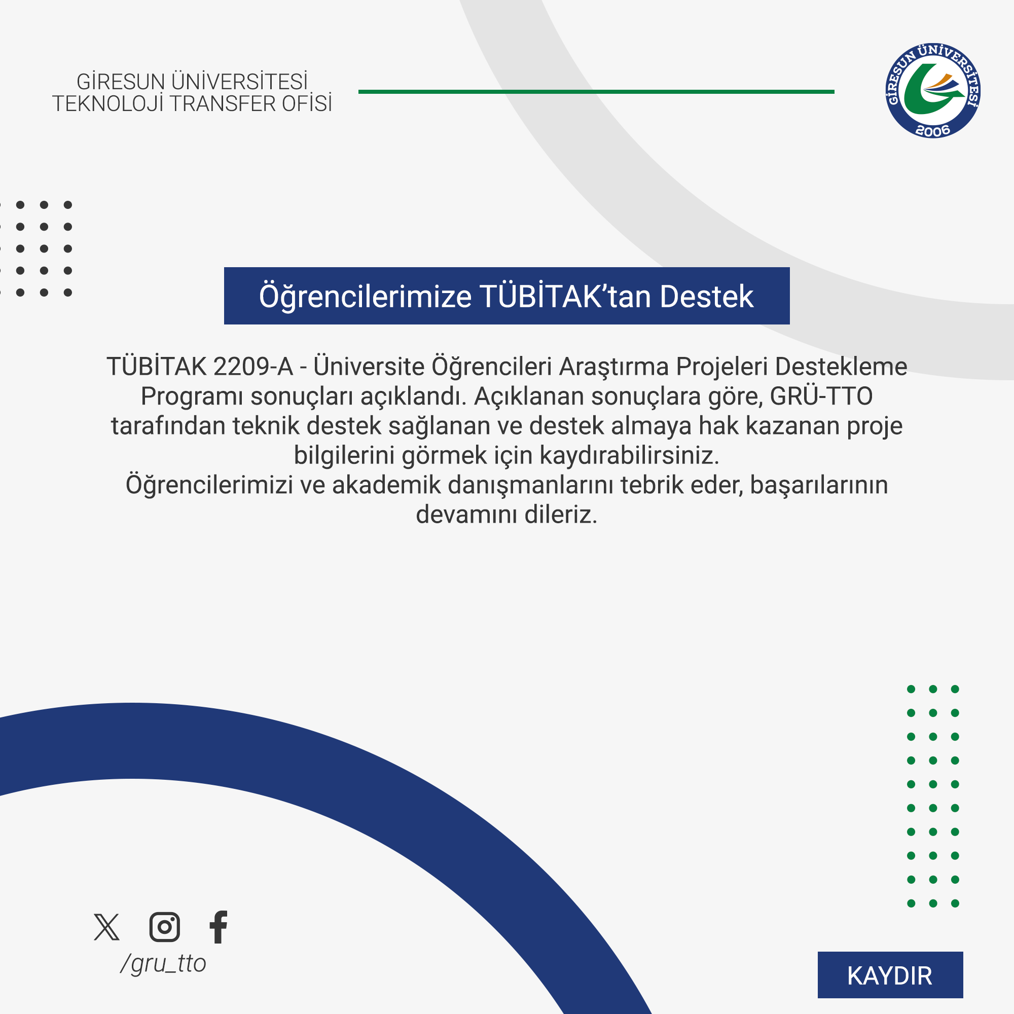 Giresun Üniversitesi öğrencilerine TÜBİTAK'tan destek sağlandı. Öğrenci projeleri ve Ar-Ge çalışmaları desteklenmektedir.